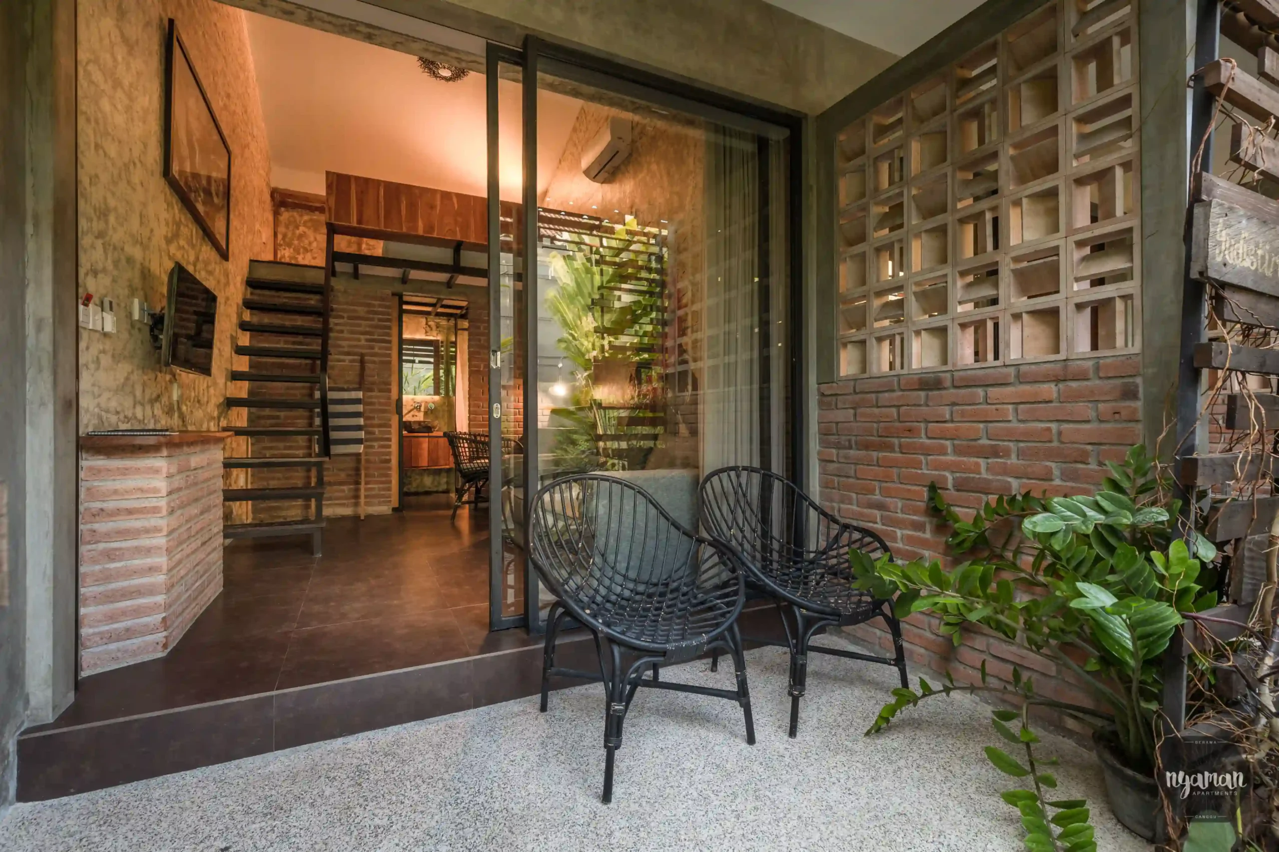 The apartment itself has 1 bed, 1 private bathroom, sofa bed, linen, towels, working table and chair, table lamp, a flat-screen TV, simple wardrobe, sitting area at the terrace facing the pool. The shared kitchen is fully-furnished.